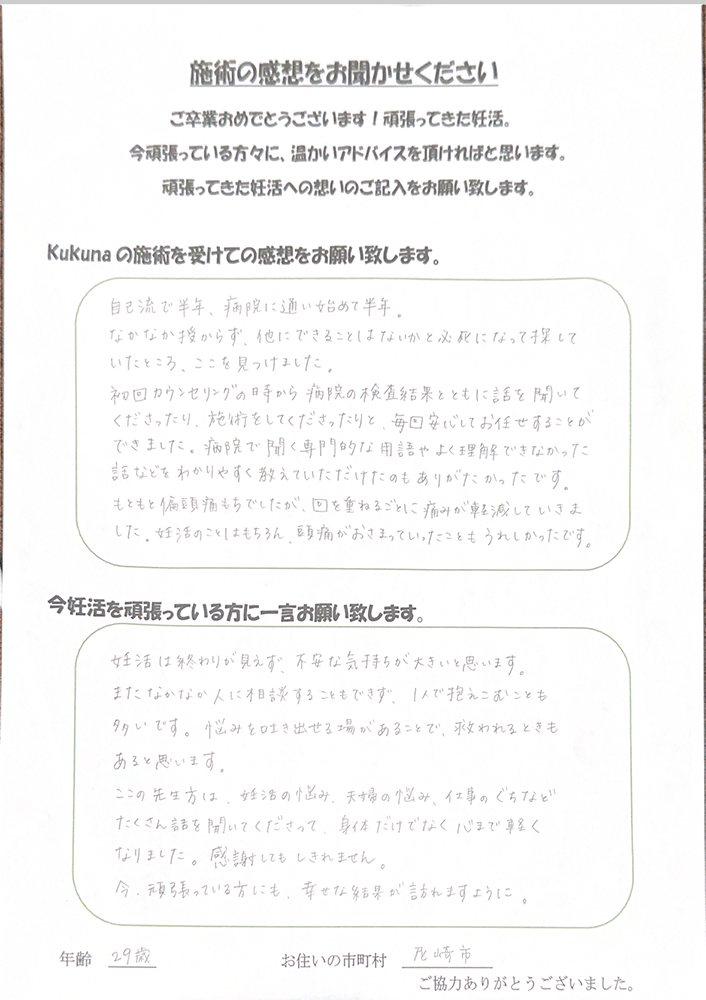 そんな気持ちでいっぱいでしたが先生に話を聞いてもらい施術を受けていくうちに体が変わっていく実感が出てきた次の周期に陽性反応が出ました^_^